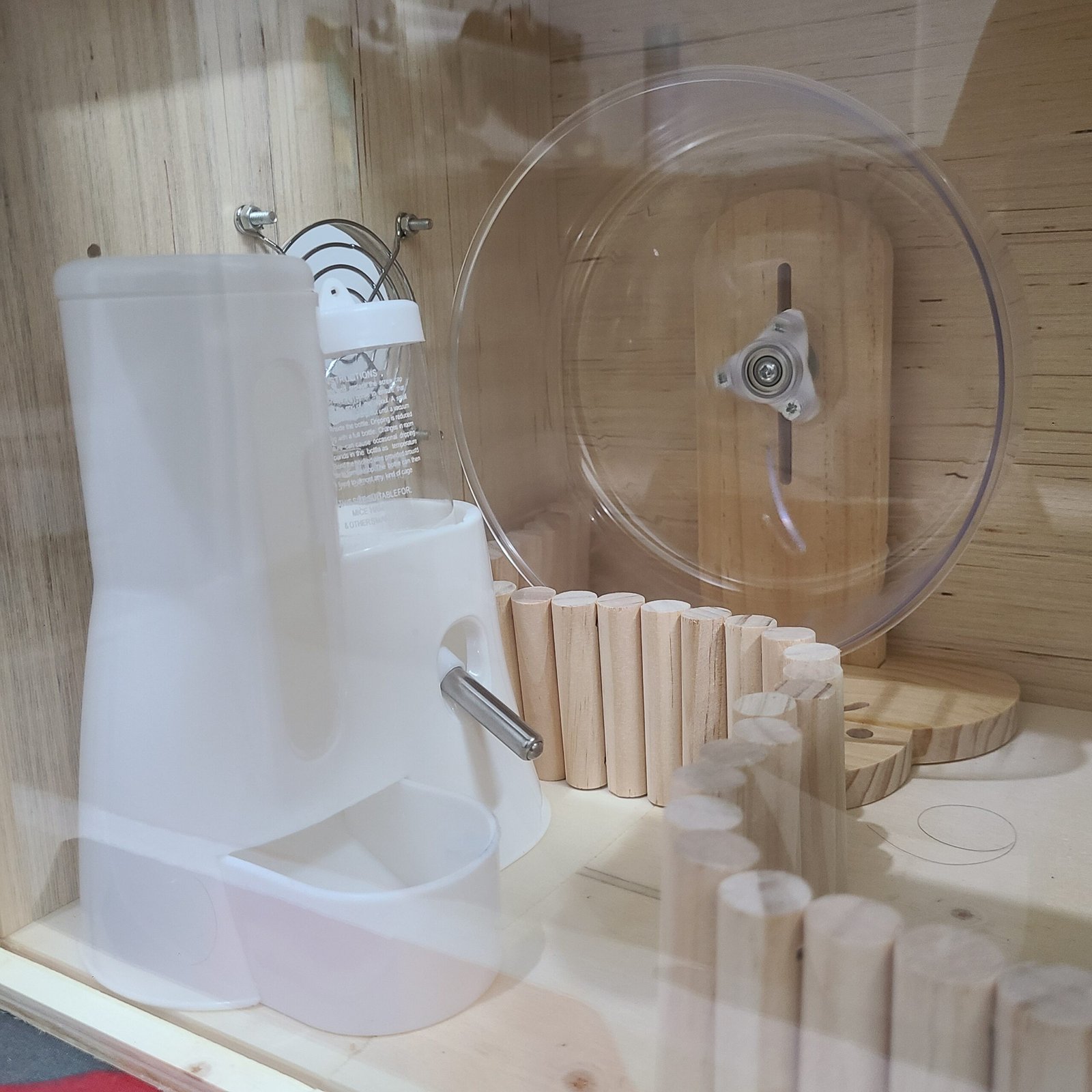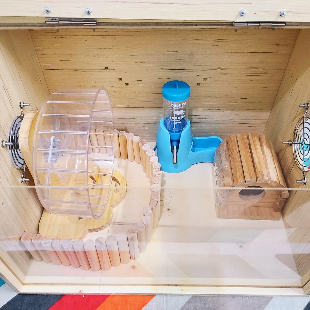 Hamster Starter Kit Bundle – Wooden Enclosure 40x30x30cm, Acrylic Wheel, Water Bottle, Hideout